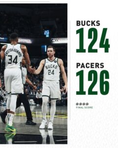 Antetokounmpo se quedó a un punto de la mejor cifra de su carrera, pero envió fuera un pase con 1:03 minutos por jugar. Fue despojado del balón por Mathurin con 30 segundos faltantes.