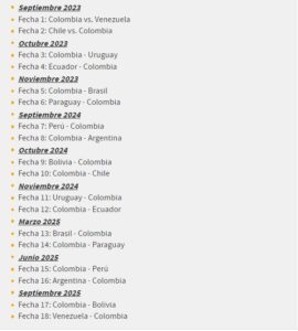 El calendario para las Eliminatorias Sudamericanas para el Mundial 2026 no presentó ninguna modificación respecto al que se utilizó para Qatar 2022. Colombia abrirá como local ante Venezuela y cerrará ante el mismo rival de visitante.