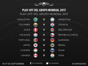 Kazajistán, Croacia y Japón serán los rivales de Argentina, Colombia y Brasil, respectivamente, en el repechaje de permanencia-ascenso en el Grupo Mundial de la Copa Davis, según el sorteo celebrado este martes en la sede de la Federación Internacional de Tenis (ITF) en Londres.