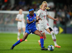 Dinamarca salió a jugar contra Haití con un oído puesto en el duelo entre Inglaterra y RP China. Con la ventaja rápida de las inglesas, llegó la tranquilidad al Estadio Rectangular de Perth: las danesas podían clasificarse simplemente obteniendo un empate. Sin embargo, el elenco europeo impuso sus condiciones y tuvo un desarrollo favorable, en el que fue protagonista. Así, a los 21 minutos abrió el marcador a través de un penal ejecutado por Pernille Harder.