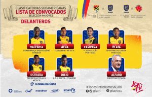 Delanteros: Énner Valencia (Fenerbahce, Turquía), Angel Mena (León, México), Leonardo Campana (FC Famalicão, Portugal), Gonzalo Plata (Sporting de Lisboa, Portugal) , Michael Estrada (Toluca, México) y Jhojan Julio (Liga de Quito).
