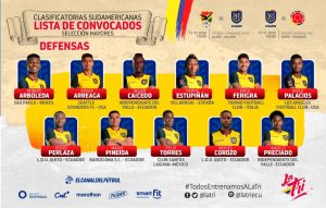 Defensas: Robert Arboleda (Sao Paulo, Brasil), Xavier Arreaga (Seattle Sounders EE.UU), Beder Ciacedo (Independiente del Valles), Pervis Estupiñán (Villarreal, España), Erick Ferigra (Torino, Italia), Diego Palacio (Los Ángeles, EEUU), Pedro Perlaza (Liga de Quito), Mario Pineida (Barcelona), Félix Torres (Santos, México), Ángelo Preciado (Independiente) y Moíses Corozo (Liga de Quito).