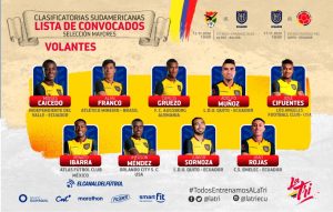Volantes: Moisés Caicedo (Independiente del Valle), Alan Franco (Atlético Minerio, Brasil), Carlos Gruezo (Augbursg, Alemania), Adolfo Muñoz (Liga de Quito), José Cifuentes (Los Ángeles FC, EE.UU), Renato Ibarra (Atlas, México), Jhegson Méndez (Orlando City, EE.UU), Junior Sornoza (Liga de Quito) y Joao Rojas (Emelec).
