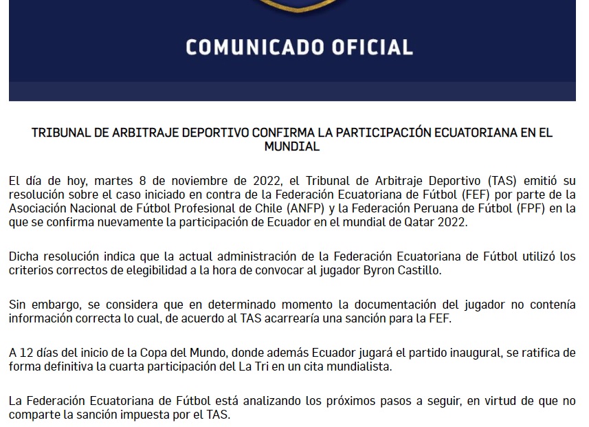 Este martes el Tribunal Arbitral del Deporte (TAS) falló en contra de Ecuador en el caso del futbolista Byron Castillo, pero no dio lugar al pedido de Chile de sacar a La Tri del Mundial de Qatar. El organismo reconoció errores en la documentación del futbolista y por eso decidió imponerle al seleccionado dirigido por Gustavo Alfaro una multa económica y la quita de tres puntos para las próximas Eliminatorias.
