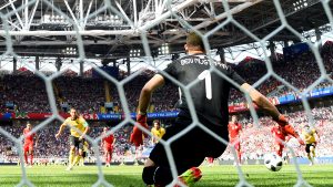 A los cuatro, el defensa tunecino Syam Ben Youssef cometió una falta a Hazard, justo sobre la línea derecha que delimita el área. El penal fue decretado por el árbitro estadounidense Jair Marrufo y convalidado por el videoarbitraje, para que el propio Hazard convirtiera con serenidad dos minutos después.