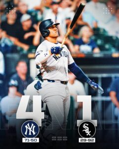 Por primera vez en su carrera, Juan Soto bateó tres vuelacercas en un juego, mientras que Néstor Cortés cubrió siete innings en blanco, para que los Yankees de Nueva York vencieran el martes 4-1 a los Medias Blancas de Chicago y se colocaran como líderes solitarios de la División Este de la Liga Americana. Soto castigó al abridor Jonathan Cannon (2-6) con un jonrón de dos carreras por todo el jardín izquierdo en la tercera entrada. Desapareció la pelota por el otro prado para inaugurar el quinto acto.
