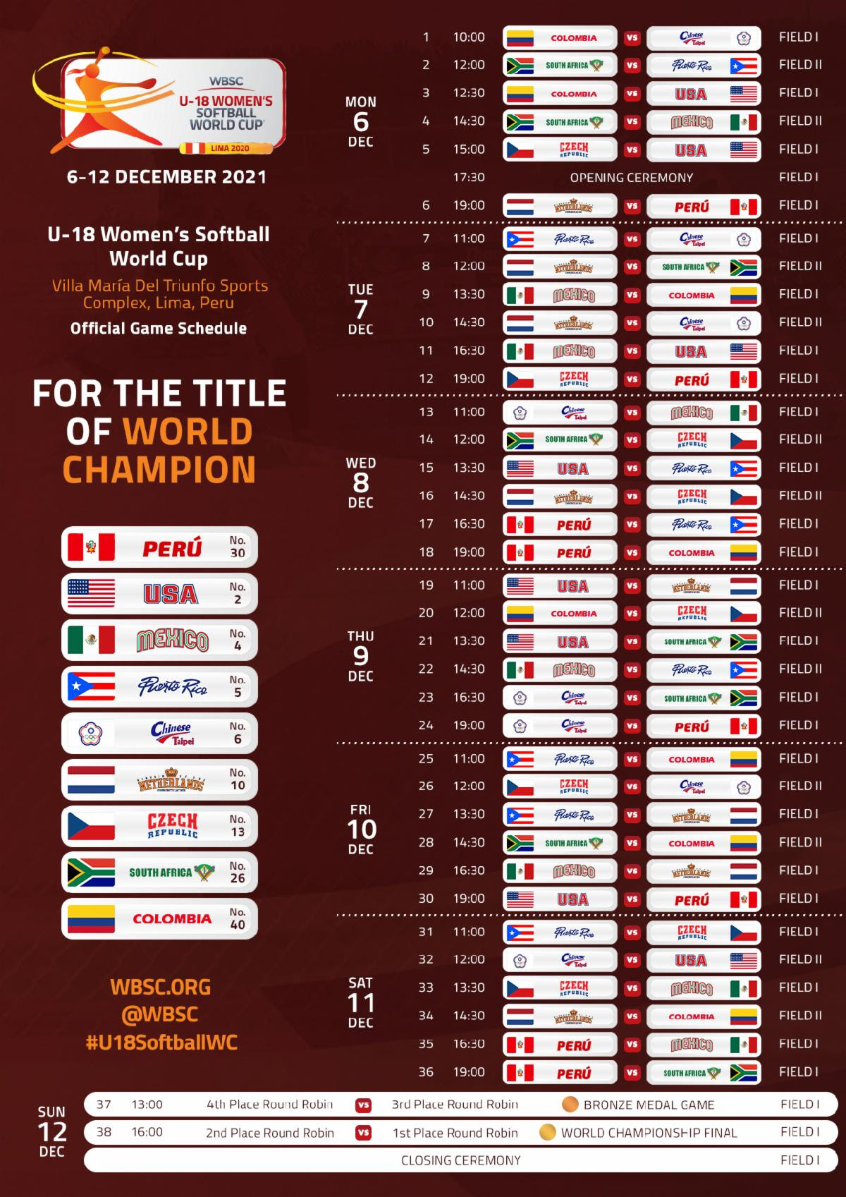 El primer lanzamiento del torneo está programado para el lunes 6 de diciembre a las 10 am, con Chinese Taipei enfrentándose a Colombia en el Juego 1. La ceremonia de apertura tendrá lugar a las 5:30 pm, antes de que el anfitrión Perú haga su debut en el torneo. contra Holanda.