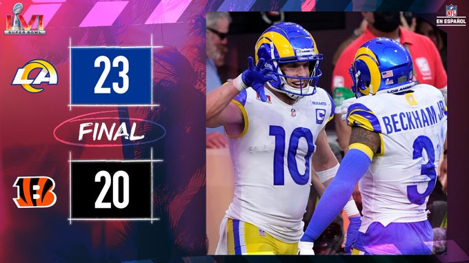 Los Angeles Rams conquistaron este domingo el segundo campeonato de la NFL de su historia al vencer 23-20 a los Cincinnati Bengals en el Super Bowl LVI.