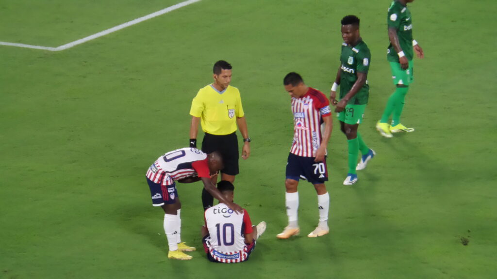 El problema de ‘Cariaco’ sucedió en el primer tiempo del empate 0-0 entre Junior y Atlético Nacional en el estadio Metropolitano, cuando fue atropellado por el futbolista rival Edwin Torres, después de entregar un pase a la zona media del campo.