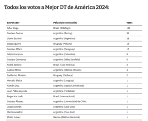 El técnico de 52 años se convierte así en el segundo portugués que se queda con esta distinción en los últimos cinco años. Su predecesor había sido Abel Ferreira en 2021, cuando llegó a la cima del continente con Palmeiras. Artur Jorge obtuvo 118 votos de 244 posibles (48%) y superó por amplia diferencia a los integrantes del podio. Le siguen Gustavo Costas, el DT campeón de la Copa Sudamericana con Racing, que recibió 31 sufragios (12.7%), y Lionel Scaloni, el líder de la selección argentina bicampeona de América con 28 votos (11.5%).