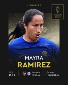Ayer miércoles, se han dado a conocer los listados de nominados para las diferentes categorías del Balón de Oro, premio que pretende reconocer a lo mejor del balompié mundial. La representación de Colombia estará por cuenta de Mayra Ramírez, quien está entre las 30 opcionadas a mejor jugadora de la rama femenina.