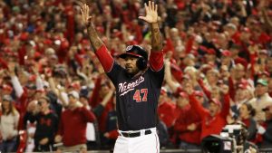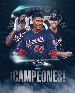 Y antes de desatar el festejo con champaña en el clubhouse, el piloto boricua hizo una pausa cerca de la cueva. Alzó el trofeo plateado que acredita a Washington como monarca de la Liga Nacional y lo mostró a los fanáticos que seguían brincando y gritando en el graderío.