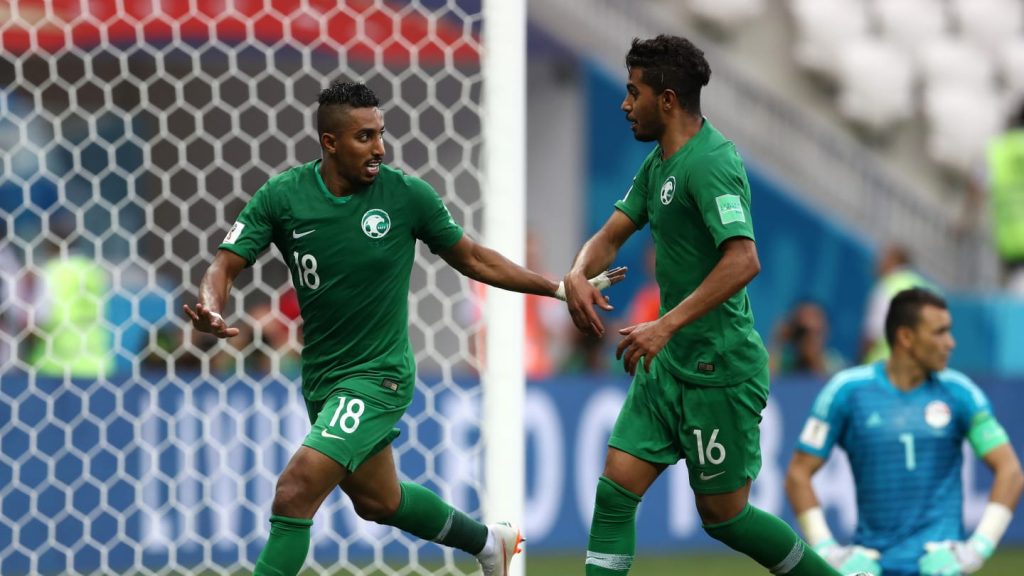 Salman Alfaraj empató de penal en el descuento del primer tiempo, después de que Ali Gabr fuese derribado dentro del área por Fahad Almuwallad, y Salam Aldawasri marcó el tanto de la diferencia segundos antes del silbato final, con un remate desde un ángulo difícil que superó a Essam El Hadary, el arquero de mayor edad que interviene en un partido de la Copa Mundial.