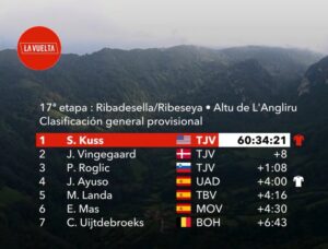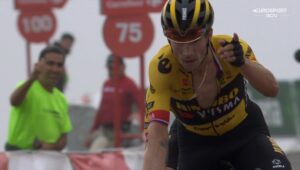 En el tramo empinado del Alto de L’Angliru, Remco Evenepoel (Soudal – Quick-Step) finalmente abandonó su aventura. Romain Bardet (DSM – Firmenich) atacó desde el grupo de favoritos . El equipo Bahrein – Victorious todavía estaba representado por cinco hombres y era, con diferencia, el equipo más fuerte de la actualidad. Cuando se volvió a acelerar el ritmo, el grupo de favoritos explotó. Después de que Aleksandr Vlasov (Bora – hansgrohe) ya no pudiera participar, también se vieron afectados su compañero de equipo Cian Uijtdebroeks (Bora – hansgrohe) y Juan Ayuso (EAU), así como Joao Almeida (EAU) . Sólo Enric Mas(Movistar) pudo seguir inicialmente al trío formado por Bahréin – Victorious y los tres capitanes del Jumbo – Visma. Pero a falta de 4,5 kilómetros también tuvo que rendirse. La gran batalla entre los dos equipos estaba en marcha, al menos por un corto tiempo.
