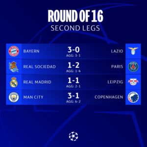 Sin sorpresas, Real Madrid y Manchester City cumplieron este miércoles en la vuelta de octavos de Champions ante Leipzig (1-1) y Copenhague (3-1), respectivamente, y unieron sus nombres a los de París SG y Bayern de Múnich en unos cuartos de final en los que, de momento, figuran las grandes escuderías del fútbol europeo.