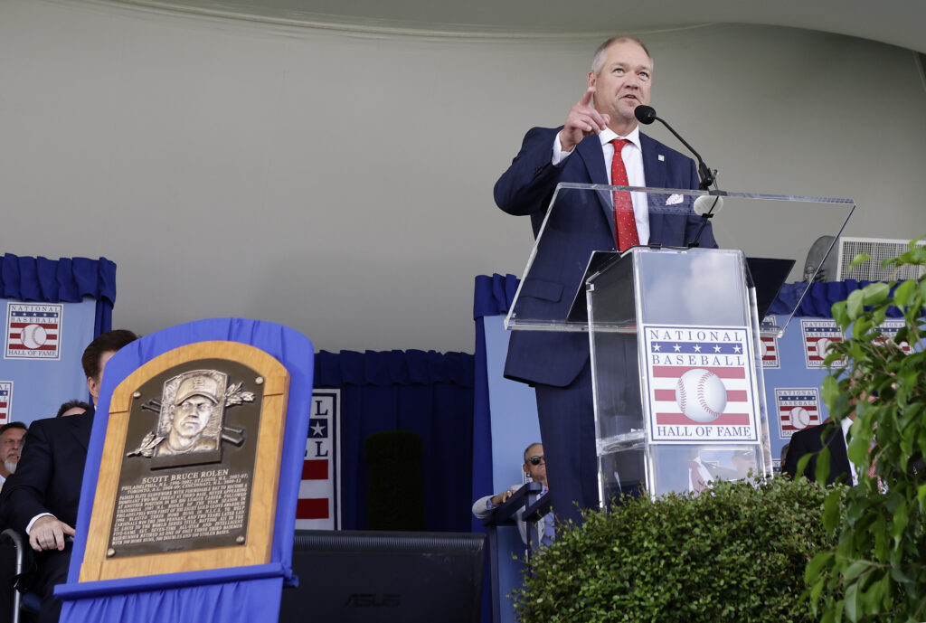 “Ver a mi madre y a mi padre caminar a sus asientos desde mi posición en tercera base fue una sensación nunca superada en mis 17 años”, recordó Rolen durante su discurso de aceptación de 16 minutos.