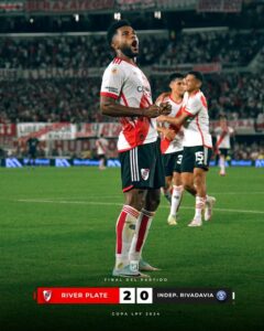Un doblete del colombiano Miguel Ángel Borja permitió este miércoles a River Plate doblegar este miércoles por 2-0 a Independiente Rivadavia de Mendoza y alcanzar a Argentinos Juniors en la cima de la clasificación del Zona A de la Copa de la Liga Profesional.