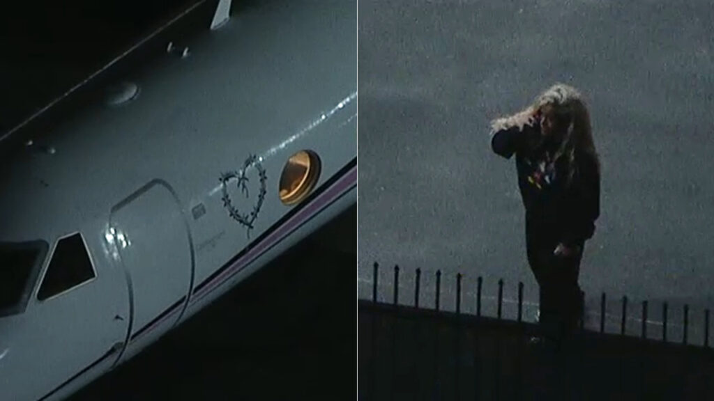 AIR7 HD de la cadena ABC estaba sobrevolando la zona mientras la artista colombiana de reggaeton, ganadora de un Grammy, salía del avión y abrazaba a amigos y acompañantes en la pista.