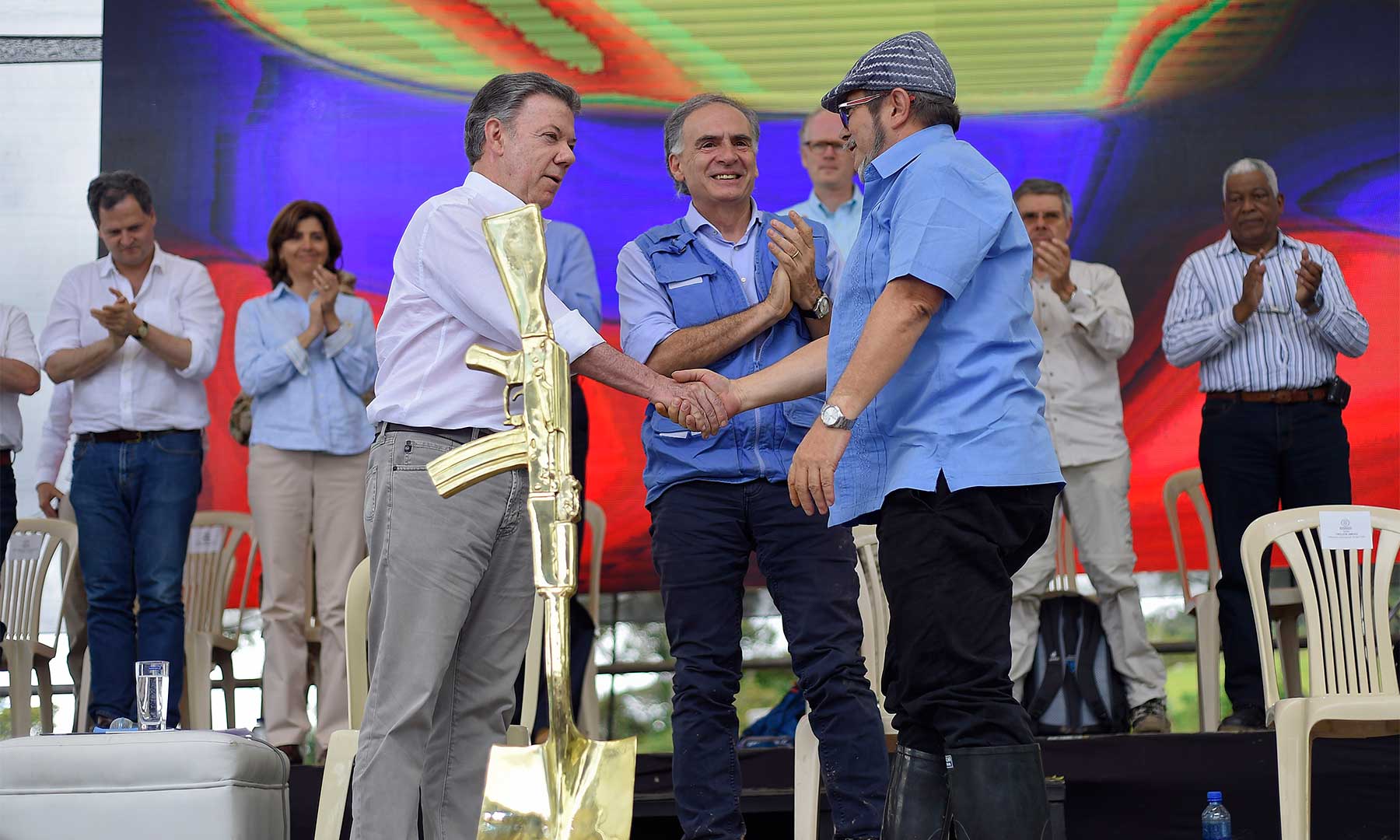 En la ceremonia participaron el Presidente Juan Manuel Santos; el jefe de las Farc, Rodrigo Londoño, y el jefe de la Misión de la ONU en Colombia, Jean Arnault.