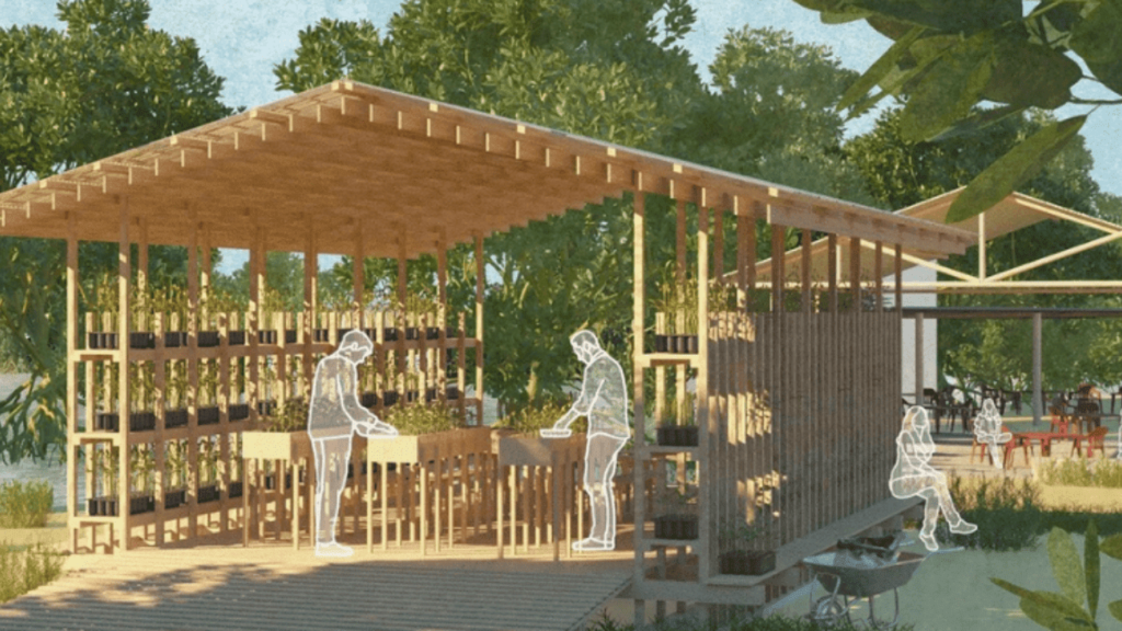 El proyecto propone un espacio abierto dirigido al aprendizaje de la siembra de mangle en la Ciénaga de Mallorquín. La estructura se plantea, en su mayoría, en madera amargo, excepto las tejas y la cimentación en concreto necesaria para levantar la pieza y protegerla del nivel del agua.