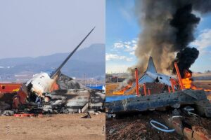 El avión Boeing 737-800 operado por la aerolínea surcoreana de bajo costo Jeju Air abortó su primer intento de aterrizaje por razones que no estaban claras por el momento. Luego, durante su segundo intento de aterrizaje, recibió una advertencia sobre impacto de aves desde el centro de control en tierra antes de que su piloto emitiera una señal de socorro. El avión aterrizó sin su tren de aterrizaje delantero desplegado, se salió de la pista, chocó contra un muro de concreto y estalló en una bola de fuego.