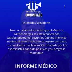 Un nuevo comunicado sobre estado de salud del músico dominicano Wilfrido Vargas, fue dado a conocer en las últimas horas por parte de la Corporación que maneja al artista. Allí se informa que su recuperación va satisfactoriamente.