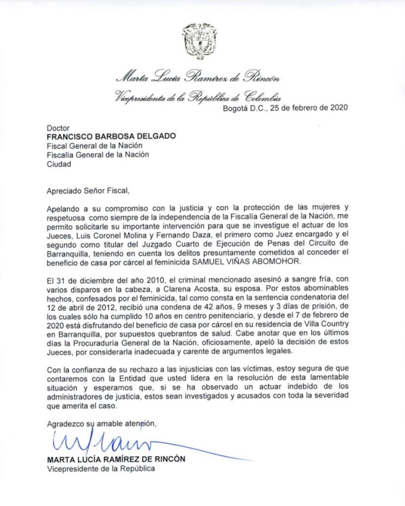 La Vicepresidente Marta Lucía Ramírez, solicitó al Fiscal General de la Nación, Francisco Barbosa, investigar a los jueces Luis Coronel Molina y Fernando Daza por concederle el beneficio de casa por cárcel al feminicida Samuel Viñas, quien asesinó a su esposa en el año 2010.