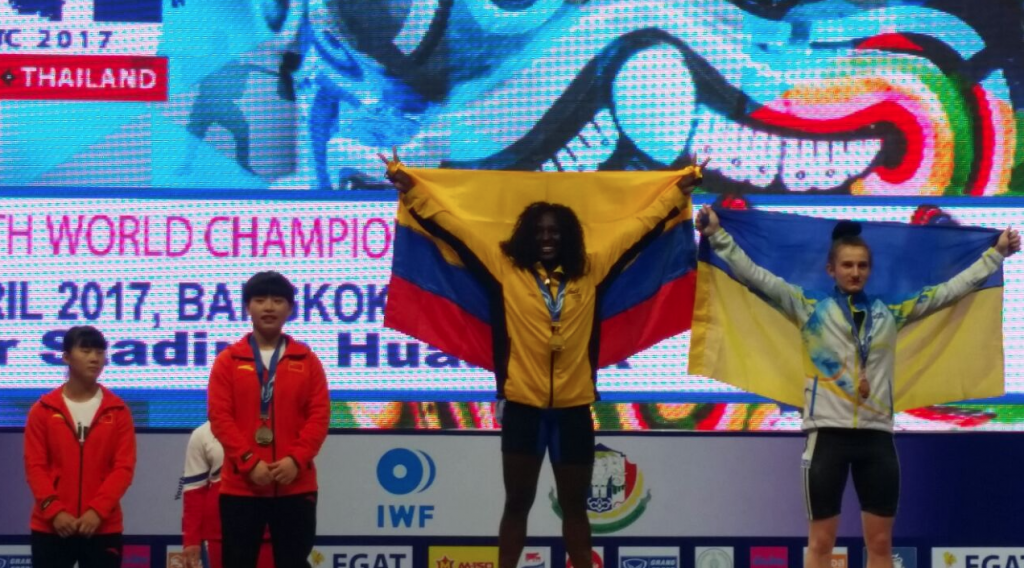 La pesista colombiana Yenny Sinisterra se colgó la medalla de oro, en la modalidad de arranque por la categoría de los 53 kilogramos, en la tercera jornada del Campeonato Mundial Sub-17 de Levantamiento de Pesas que se disputa en Bangkok, Tailandia.