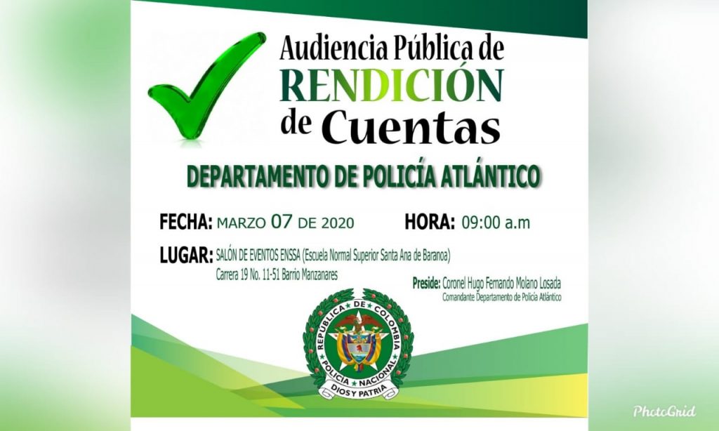 La Policía Atlántico invita a la comunidad atlanticense para que este sábado 7 de marzo participe de la ‘Audiencia pública externa’, o de rendición de cuentas, que se llevará a cabo en el salón de eventos de la Escuela Normal Superior Santa Ana de Baranoa, ubicado en la carrera 19 No 11-51, barrio Manzanares.