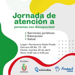 Con el fin de mitigar las barreras de acceso a la salud, educación, empleabilidad y temas jurídicos en Barranquilla y su área metropolitana, en esta jornada se busca dar información, orientación y acompañamiento a los cuidadores de personas en condición de discapacidad para que reciban la información necesaria y brindarles las oportunidades de acceder y ejercer sus derechos, con miras a facilitar la prestación de los servicios que requieren y cualificar la población.