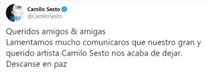 «Lamentamos mucho comunicaros que nuestro gran y querido artista Camilo Sesto nos acaba de dejar», reza el mensaje, en el que se desea que el alicantino descanse en paz, sin detallar la causa de la muerte.